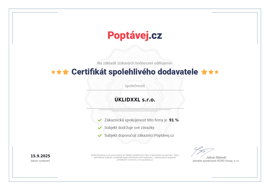 Získali jsme ocenění od Poptávej.cz jako spolehlivý dodavatel, dodržující své závazky a hlavně máme více než 90% spokojených zákazníků ! 15.9.2025